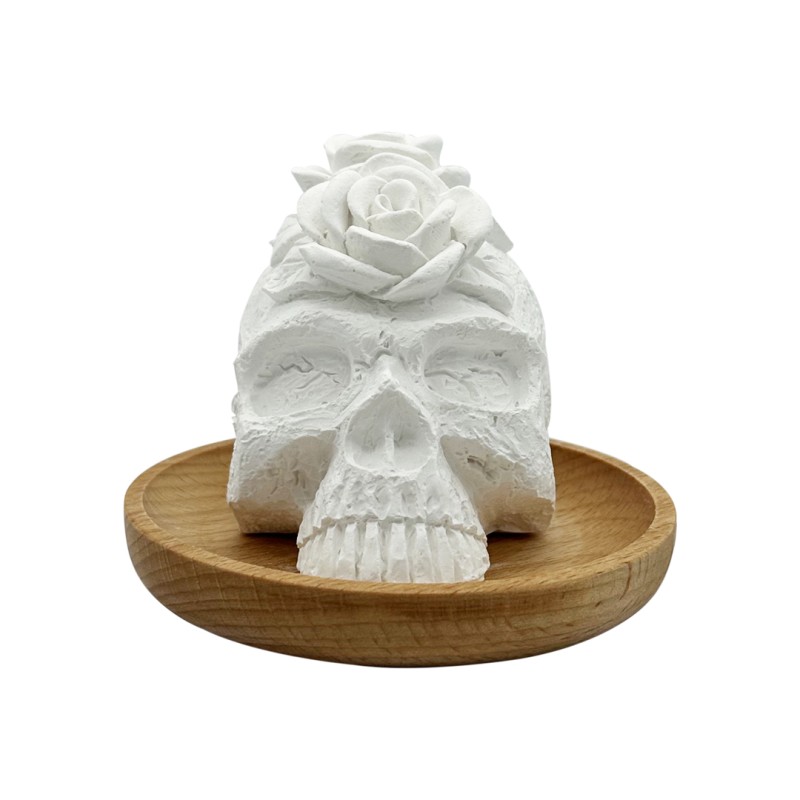 Diffuseur skull en plâtre à parfumer avec son support en bois, idéal pour une déco originale et parfumée.